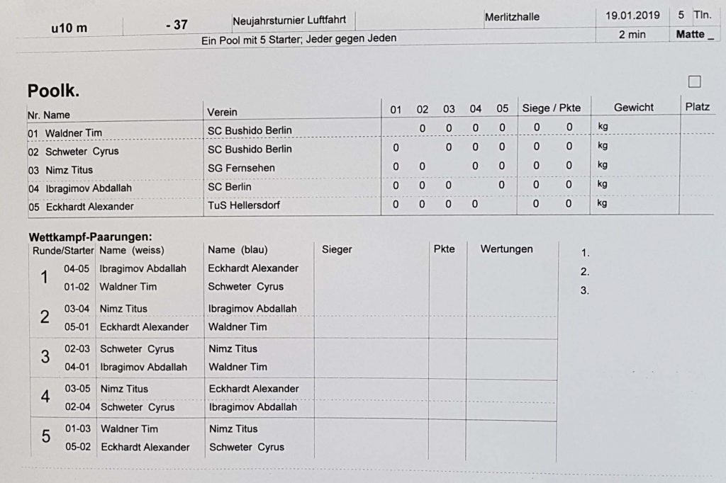 19.01.2019 – Luftfahrt Posted By gumel on 19. Januar 2019 Neujahrsturnier des SV Luftfahrt BerlinEinige Infos auf der Webseite, hier folgen in Kürze noch welche vom Kampfgeschehen.